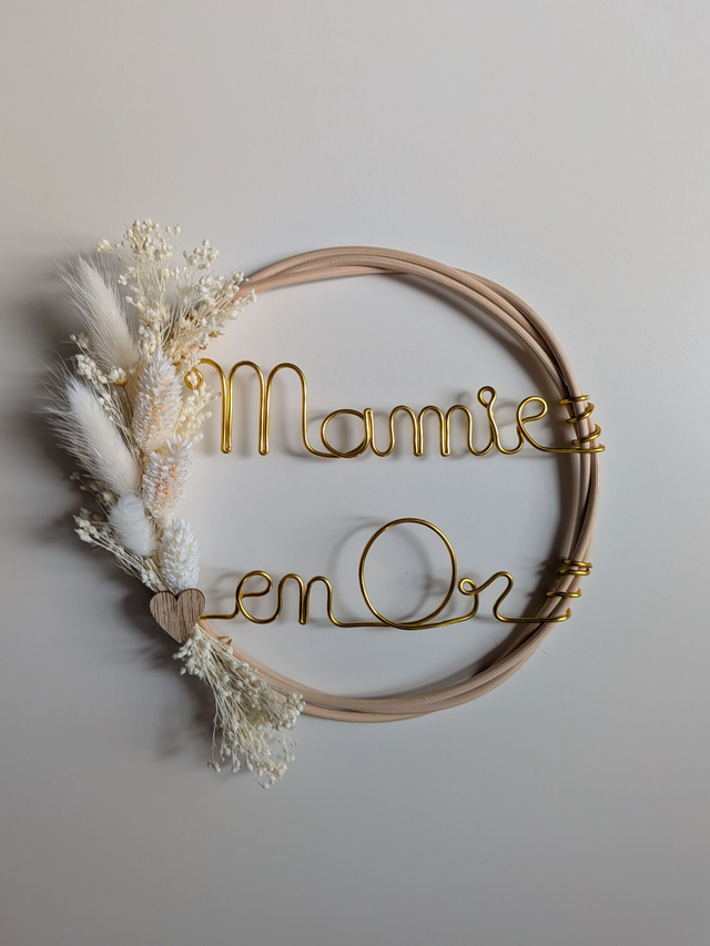 Cette décoration murale artisanale met à l'honneur le mot "Mamie", délicatement façonné à la main, accompagné de l'inscription "en Or", symbole d'amour précieux et intemporel.