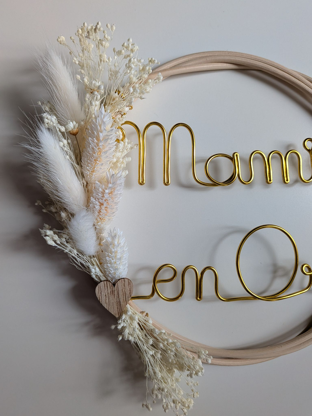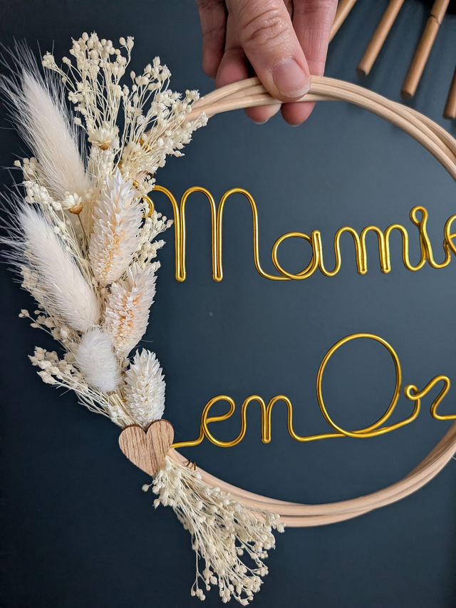 Chaque pièce est réalisée à la main, dans mon atelier situé dans les Hauts-de-France, dans un esprit bohème et naturel, mêlant bois clair, fleurs séchées et détails raffinés.