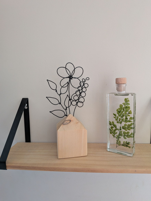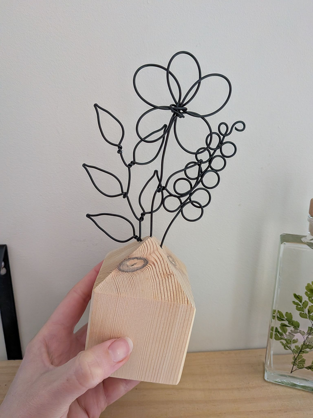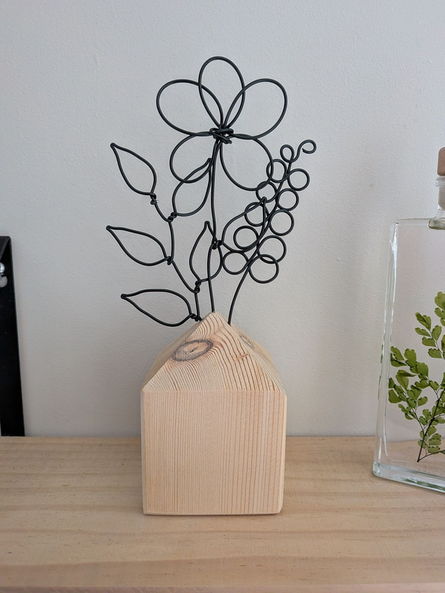 Sculpture de fleurs en fil métallique sur socle en bois.